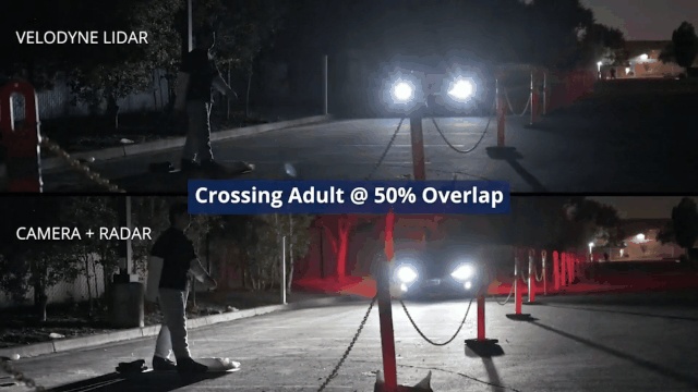 在 Velodyne 所展示的测试结果中,使用毫米波雷达和摄像头的 PAEB 系统在 6 种夜间场景下针对假人进行的测试都失败了,而搭载激光雷达的 PAEB 解决方案在 6 种场景中都避免了碰撞。