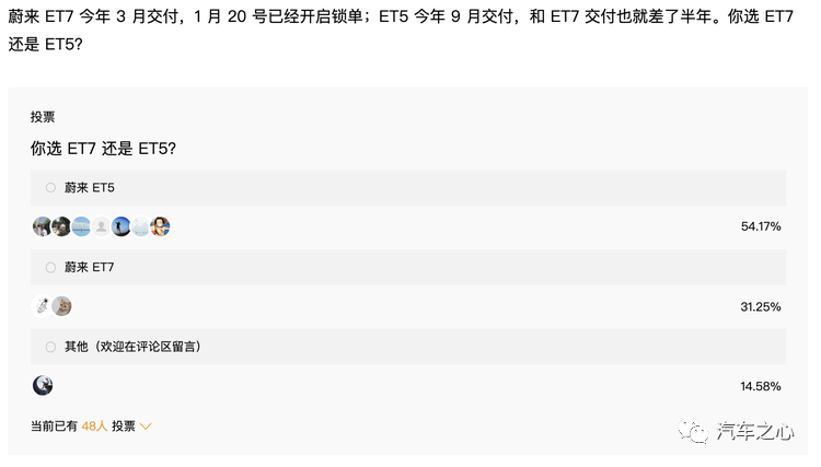最近,我们在汽车之心官网(www.autobit.xyz)做了一个关于 ET7 和 ET5 选择的投票,从投票的结果来看,超过了 54% 的人选择了 ET5 要高出选 ET7 的 30%。