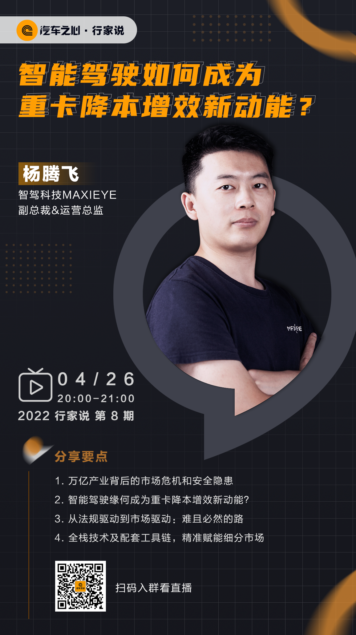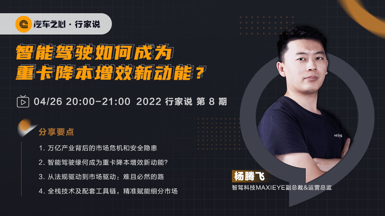 汽车之心·行家说 2022 年第 8 期,智驾科技MAXIEYE 副总裁&运营总监杨腾飞将与我们分享「智能驾驶如何成为重卡降本增效新动能?」。欢迎大家添加微信 autobit007 预约收看直播。