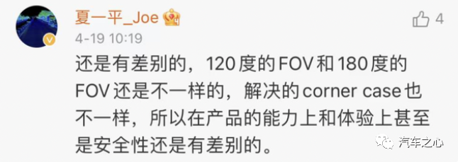 集度汽车 CEO 夏一平:还是有差别的,120 度的 FOV 和 180 度的 FOV 还是不一样的,解决的 conrner case 也不一样,所以在产品的能力上和体验上甚至是安全性还是有差别的。