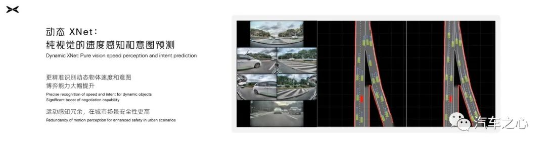 动态方面,Xnet 具备更强的 360 度感知,可以在视觉识别的基础上输出目标物的位置、姿态、尺寸、速度等信息,甚至可以预测目标轨迹,使规控的「博弈」能力大幅提升,变道成功率更高。