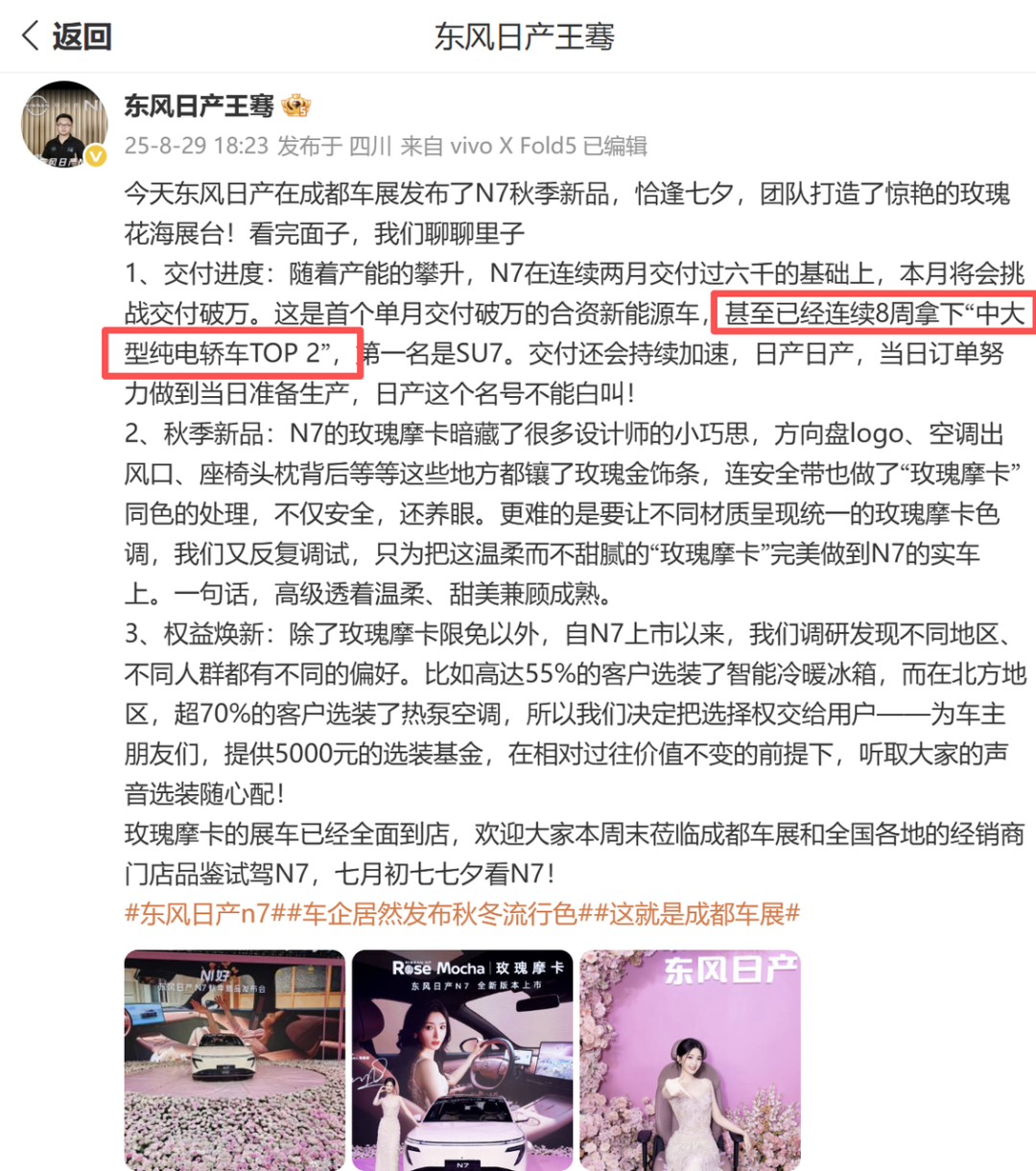 奇瑞风云 A9L,8 月交付量达到 10243 辆。凭借「空间+续航+智驾」的组合拳,在中大型插混市场快速出圈。东风日产 N7,8 月交付 10148 台,环比增长 57%。这也是首个单月交付破万的合资新能源车。东风日产新能源品牌总经理王骞在微博上写道:「已经连续 8 周拿下中大型纯电轿车 TOP 2,仅次于小米 SU7。」对一家合资车企而言,这一成绩的意义不言而喻。广汽丰田铂智 3X,8 月交付 7324 台,连续 4 个月环比增长,目前还手握 8800 多台未交付订单。这也是广汽丰田新能源产品线中首个「稳步放量」的车型。新一代智己 LS6,从 8 月中旬预售启动到 9 月上市,智己 LS6 的热度一路攀升——预订量突破 5 万台,上市不到半小时,大定就破万辆。智己汽车在中高端纯电市场的爆发,显然也与全面升级的智驾体验相关。仰望 U8L 鼎世版在预售开启 72 小时内订单突破 2 万台。别克至境 L7 全国首秀时,将智驾体验作为核心宣传点。虽然没有公布具体订单,但已有超过 60% 的订单来自合资燃油车用户转化,说明用户已经在用脚投票。奥迪 E5 Sportback 在发布会上,把高阶智驾体验作为核心亮点进行展示,这也是其在半小时内收获超 1 万个订单的重要原因。