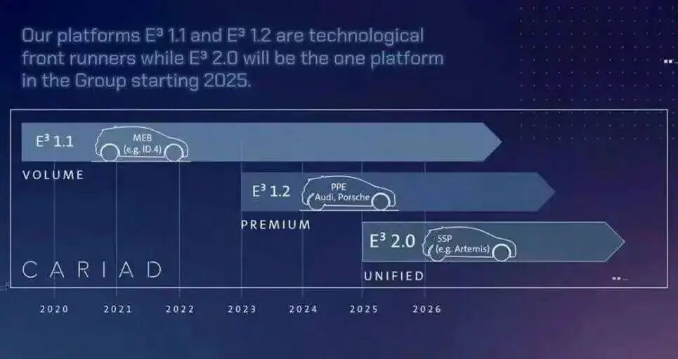 MEB 平台的电子电气架构为 E3 1.1,PPE 平台 E3 1.2,下一代统一式的 SSP 平台是 E3 2.0,支持 L4 级自动驾驶。
