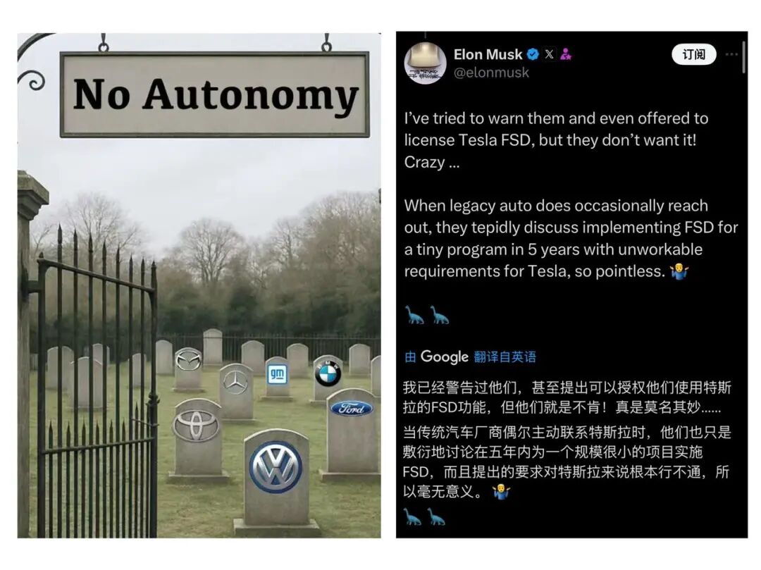 有人发了一张全球头部车企进入「智能化坟墓」的梗图,马斯克在 X 上吐槽回应:以前我就说过可以授权这些车企用特斯拉 FSD,但是他们就是不肯用。
