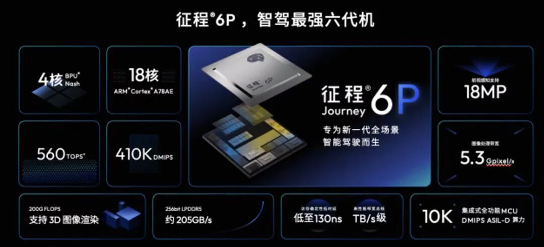 仅仅征程6P 这颗芯片就来头不小,稀疏算力 560TOPS,是国内为数不多专门用于智驾的自研大算力芯片。