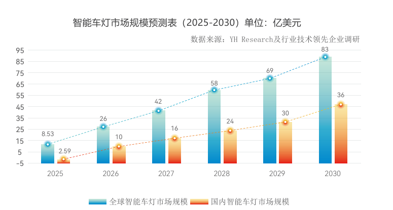 在这一系列能力叠加下,AR-HUD 的角色正发生根本变化,成为参与驾驶判断的安全交互入口。这种角色转向,本质上依赖于系统级能力的长期积累,基于这个维度,华为乾崑车载光通过技术融合与生态共建,推动 AR-HUD 跨过「展示阶段」,迈向真正可依赖的安全交互层。从智能车灯、AR-HUD 的演变过程,可以窥见车载光逐步被放大的价值,它正在成为智能汽车体验与安全的关键接口层。一个新共识正在形成:车载光,是下一个确定性的增长引擎。这是一片正在加速打开的千亿级蓝海市场。《白皮书》显示,2025-2030 年期间,全球智能车灯市场规模预计将从 8.53 亿美元快速扩张至 83 亿美元;有研报告同样预测,AR-HUD 全球收入规模将在今年突破 80 亿美元。更重要的信号来自渗透率端的跃迁。华为车 BU 智能车载光领域总经理陈双宝在峰会上透露:2025 年 1–10 月,智能 HUD 渗透率同比增长 70%,智能车灯渗透率同比增长 127%。这一增速已经说明,行业对车载光价值的认知发生根本性转变。由此,车载光市场正在进入一个清晰的三阶段演进周期:无论是 AR-HUD、智能车灯,过去两年基本都覆盖在 30 万级以上价格带,用于验证显示效果、系统稳定性与法规边界。这也是所有智能化汽车技术必须经历的起点。最显著特征为,成本曲线的松动。智能网联汽车研究院预测,2025 年新车 AR-HUD 装配量同比增长已超过 50%,并将在 2026 年加速向 25 万元以下车型渗透,有望成为新的「标配屏」。智能车灯亦呈现出高度相似的下沉路径,预计 2026 年百万像素级智能车灯将进入 20 万元级车型区间。进入这一阶段,竞争焦点将不再是「有没有」,而是谁的方案能够成为行业标准。在马太效应加速显现的背景下,真正留在牌桌上的,将只剩下少数具备系统能力的玩家。以华为乾崑为代表的头部选手,正凭借先发优势逐步勾勒出赢家画像,其核心能力集中体现在三点:这三重能力,都是华为乾崑车载光在整个乾崑体系内,构建的差异化壁垒。值得一提的是,自提出「车载光」这一概念开始,华为乾崑并未将其视为车灯或 HUD 的简单迭代,而是将其放入智能汽车整体架构中重新定义。因此,华为乾崑在这一赛道上的投入,并非围绕某一具体产品形态展开,而是持续向上构建覆盖芯片、光学、显示、算法与系统协同的完整能力闭环。连续三年举办的智能车载光峰会,恰恰反映了这一点。峰会讨论的重点,已从单一产品参数,转向系统安全、动态稳定性、法规适配等更高阶议题。可见,华为乾崑作为车载光坐标系建立者,通过联合产业链上下游,持续做好「向上摸高」与「向外赋能」,探索光学、显示、算法与系统融合的技术边界。在这个过程中,车载光正逐步跃迁为智能汽车下一阶段体验范式的底座。这不仅是一条新增赛道,更可能是决定未来智能汽车竞争格局的又一分水岭。而华为乾崑,正通过系统能力前置与产业协同,加速点燃这一千亿级市场的启动时刻。