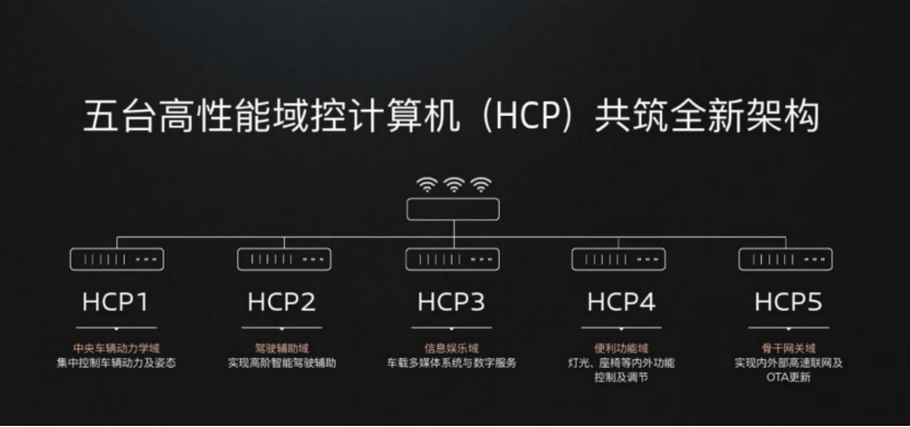 相比 E(3) 1.1 电子电气架构,E(3) 1.2 由 5 个 HCP 高性能计算平台组成,配合千兆以太网高速联通,能够支持从信息娱乐系统到底盘的 OTA。