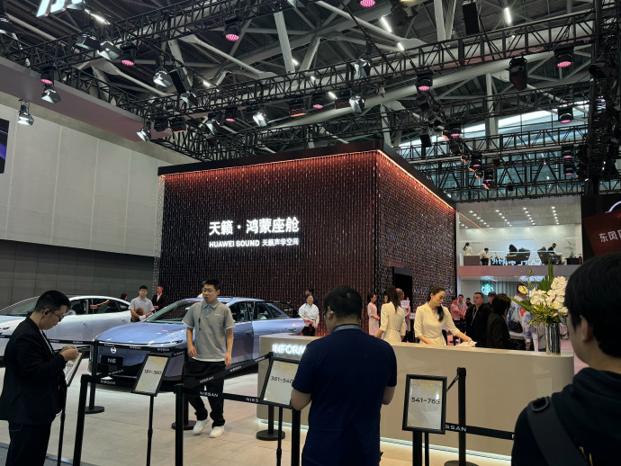 日产单独搭了块展台,展示搭载鸿蒙座舱的日产天籁。一汽大众也识相地把搭载高速 NOA 的燃油车,放在第一排。