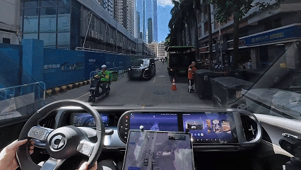 再比如在复杂的城中村窄路中行驶,在对向有 MPV 和两轮电动车的情况下,系统成功绕行垃圾车和环卫工人,紧接着又连续绕行异型车(移动垃圾桶),而这些都是在规则时代无法做到的场景。