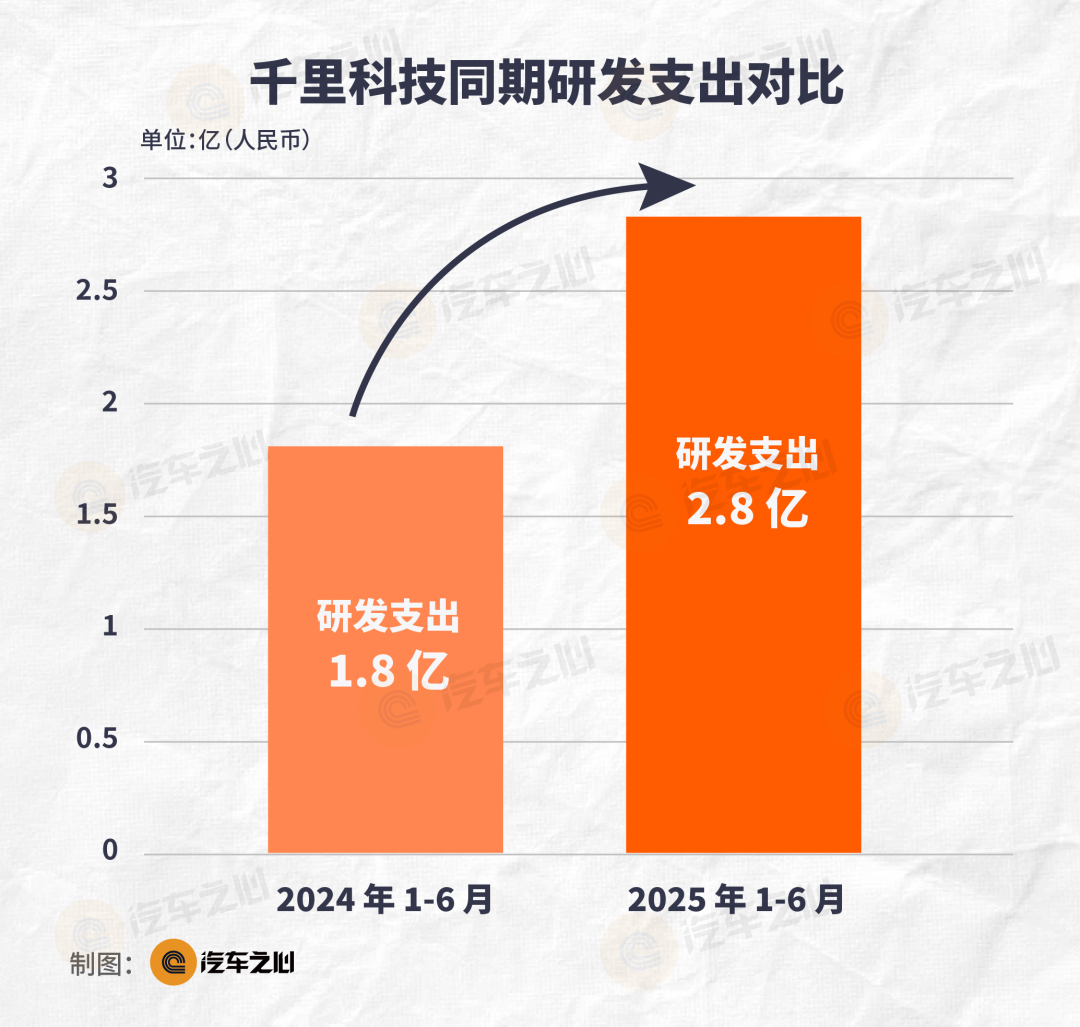 根据千里科技提交的统计期财报显示。千里科技 2024 年前半年研发支出 1.8 亿。自从新增智驾、智舱之后,千里科技同期研发增长了 60%,2025 年上半年研发支出 2.8 亿。