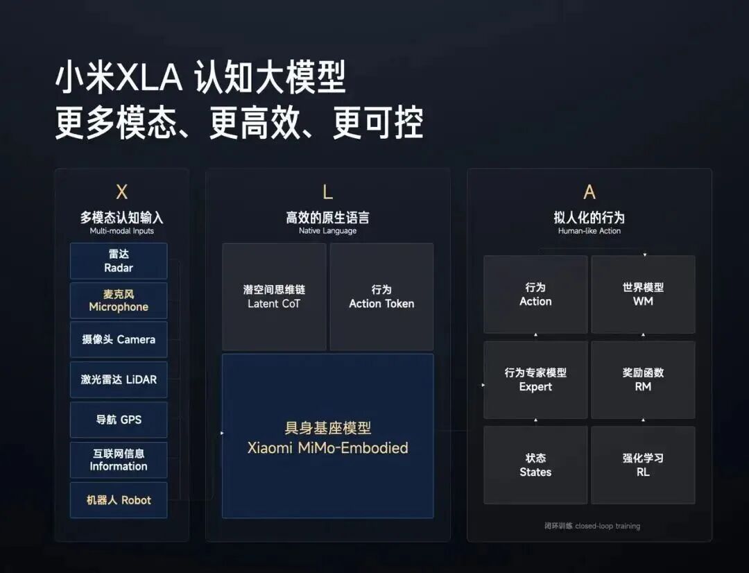 新 SU7 将会搭载小米自研 XLA 认知大模型。X、L、A 分别代表多模态认知输入、原生语言、拟人化行为,本质上这类架构也是趋近于特斯拉、小鹏等主流玩家的 VLA 模型。