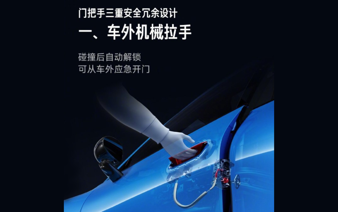 外观上新 SU7 的门把手还是半隐藏式的,实际上还新增了机械锁,如果车辆碰撞就会切换为机械解锁,外力可以解锁。