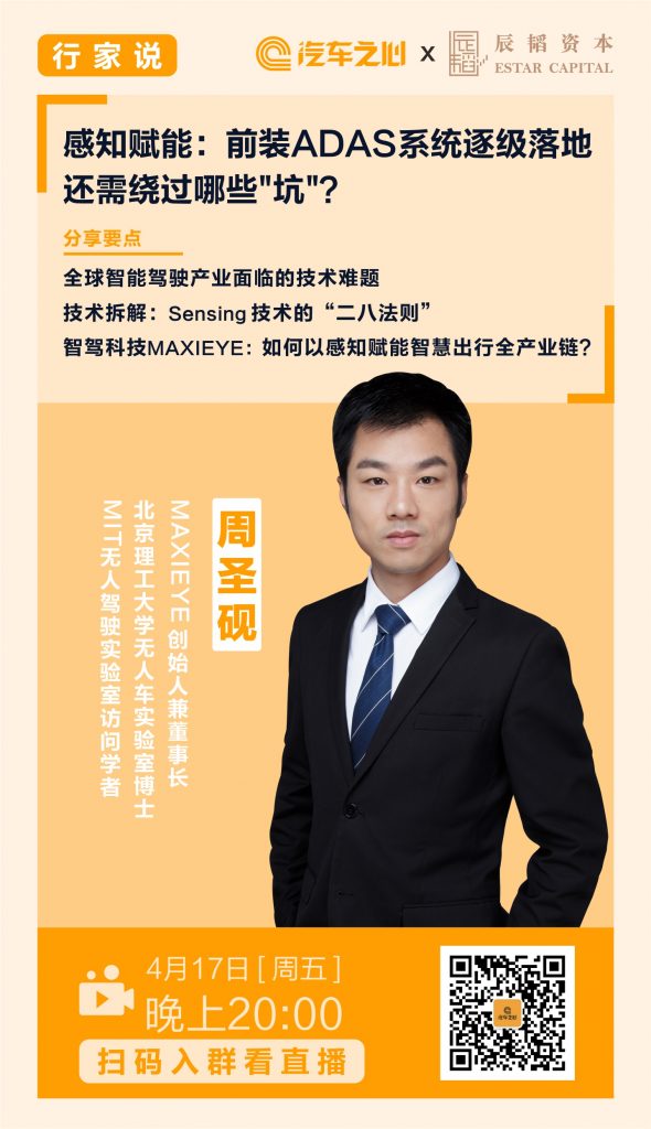 4 月 17日周五晚 20:00 – 21:00,Maxieye 创始人&董事长周圣砚将带来《感知赋能:前装ADAS系统逐级落地还需绕过哪些“坑”?》的分享。