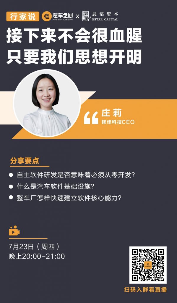 7 月 23 日周四晚上 20:00,镁佳科技 CEO 庄莉将带来主题为《接下来不会很血腥,只要我们思想开明》的分享。