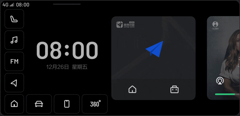 11.中控屏桌面升级至2.0版本:优化快捷入口,新增首屏播放器、动态卡片。