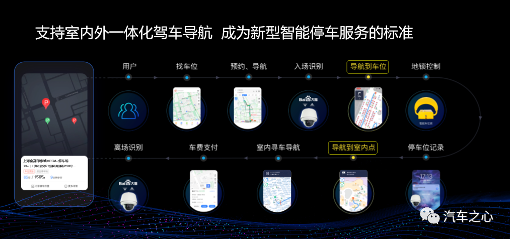 百度的地图系统可为车辆自动分配空闲泊位,并通过导航规划将驾车用户快捷引导至泊位,从而避免驾车用户在停车场内盲目寻找车位,减少场内拥堵。